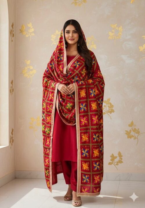 The Traditional Phulkari Work Dupatta is more than an accessory; it is a radiant, hand-stitched poem, a testament to the enduring spirit and artistry of Punjab. Originating from the rich agricultural plains of the region, Phulkari—literally meaning “flower work”—is a legendary form of folk embroidery where life itself is celebrated through vibrant threads. This dupatta offers a genuine connection to that deep-rooted heritage, presenting an authentic, breathtaking piece of wearable art that celebrates life, colour, and tradition.